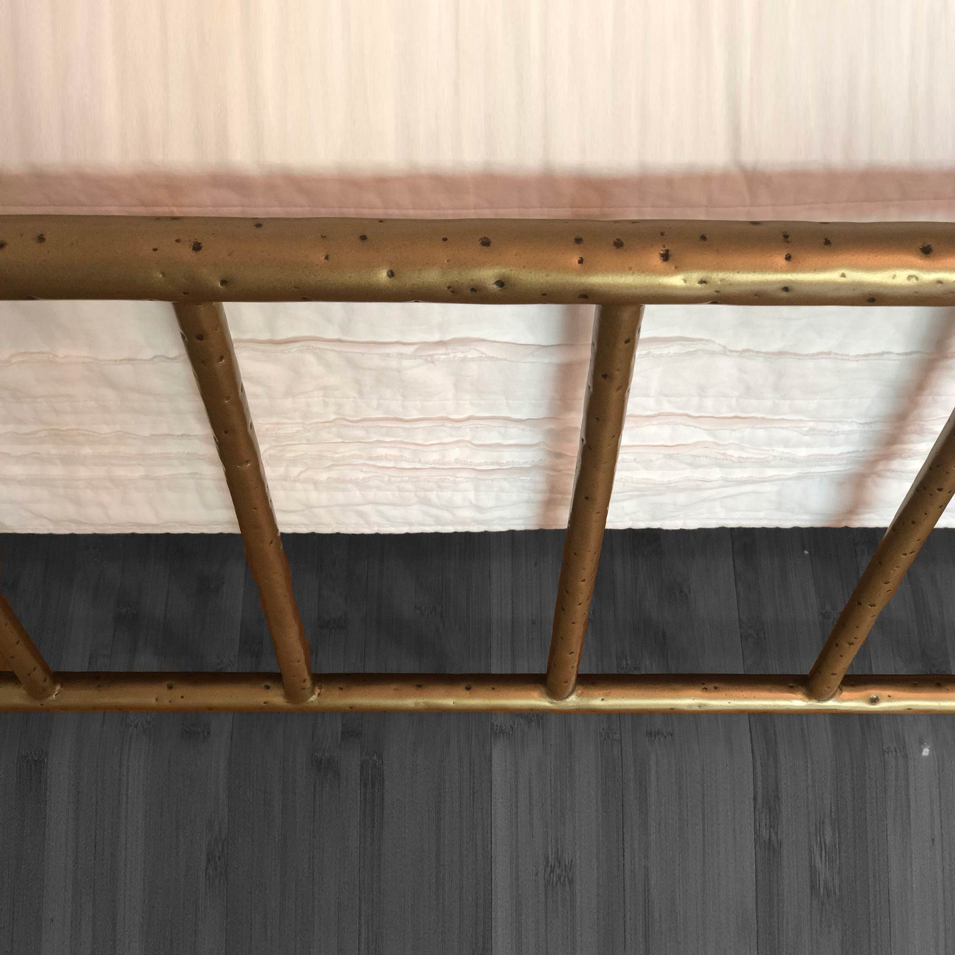 The Archaeo Pitted Brass Hammered Iron Platform Bed is crafted in the USA with artisan precision for luxury interior designers. Capturing a high-end luxury modern brass bed with the organic feel of a hammered iron bed and pitted brass, Heiressy’s Archaeo Pitted Brass Hammered Iron Platform Bed is a very durable piece of furniture and a timeless work of art. Featuring strong, welded construction and a timeless pitted brass baked-on powder-coating finish, this authentic iron bed is an heirloom of lasting beauty with a lifetime warranty. Boasting a fully welded one-piece iron headboard, like the footboard, it's the perfect centerpiece to grace your home with regal sophistication. The solid wood slats are covered with quality black canvas fabric on the tops and sides for a high-end interior designer finished look and added noise reduction, you'll find the perfect balance of strength, comfort, and quality. Sleep well knowing you have the best!